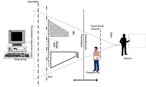 Пунктирными линиями изображены уровни детализации, такие как ЯП C++ или Техническое задание. В процессе разработки программист движется справа налево от пользователя к компьютеру. На рисунке разработчик находится примерно на уровне проектирования программы.