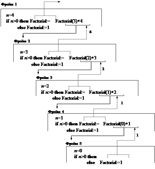 Это произойдет в фрейме №5. В этом фрейме мы получим значение Factorial =1 и передадим это значение в фрейм №4. После этого фрейм №5 будет уничтожен, так как обращение Factorial(n) при n=0 будет выполнено.