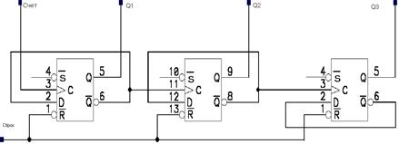 а) Принцип работы счетчика: асинхронные входы установлены в положение синхронной загрузки с входов D,C. На входе D установлено значение инвертированного выхода Q, поэтому при появлении на тактовом входе С положительного перепада в триггер записывается значение входа D, а на выходе устанавливается инвертированное значение входа. В случае счетчика типа делителя на два на выходе устанавливается сигнал того – же уровня после подачи на вход С двух импульсов. Для переключения следующего счетчика из одного уровня в тот же самый необходимо подать четыре импульса и т. д., счет составляет 2 n где n – количество триггеров, в данном случае 23=8 импульсам на входе. У данного счетчика есть одна особенность, при включении выходы Q кроме первого принимают значения 1, поэтому после включения счетчик необходимо обнулить, подав на вход R импульс.