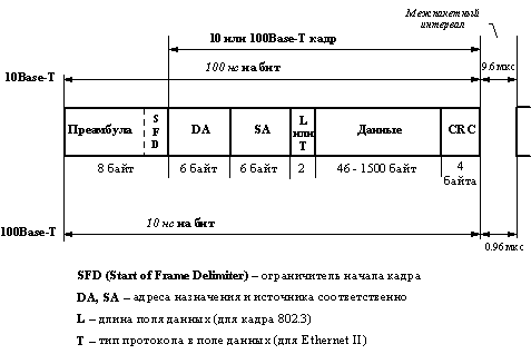 Формат кадров технологии FastEthernet не отличаются от форматов кадров технологий 10-Мегабитного Ethernet'а. На рисунке приведен формат МАС-кадра Ethernet, а также временные параметры его передачи по сети для скорости 10 Мб/с и для скорости 100 Мб/с. В качестве указания свободного канала в технологии FastEthernet используется служебные символы Idle, вместо отсутствия сигнала как это было в предыдущих версиях. Для отделения кадра Ethernet от символов Idle используется комбинация символов StartDelimiter (пара символов J (11000) и К (10001) кода 4В/5В), а после завершения кадра перед первым символом Idle вставляется символ Т. Между символами JK и Т располагаются поля преамбулы, SFD, DA, SA, L, данные, CRC.