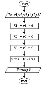 1. Ввести v1, v2, v3, t1, t2, t3. 2. S1 := v1 * t1. 3. S2 := v2 * t2. 4. S3 := v3 * t3. 5. S := S1 + S2 + S3. 6. Вывести значение S. 7. Конец. |