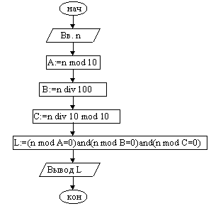 1. Ввести число n 2. A := n mod 10 {разряд единиц} 3. B := n div 100 {разряд сотен} 4. C := n div 10 mod 10 {десятки} 5. L := (n mod A=0) and (n mod B=0) and (n mod C=0) 6. Вывод L 7. Конец |