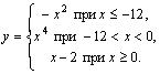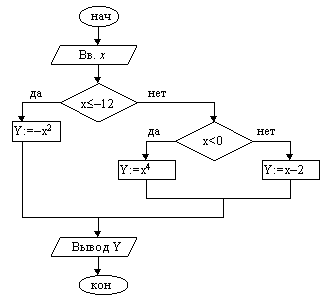 1. Ввести x. 2. Если x£–12, то y:=–x2 3. Если x<0, то y:=x4 4. y := x–2 5. Вывести y 6. Конец |