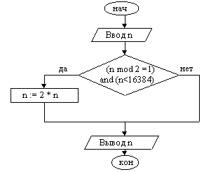 1. Ввести число n 2. Если число n нечетное и меньше 16384, то n := n * 2 3. Вывод n 4. Конец |