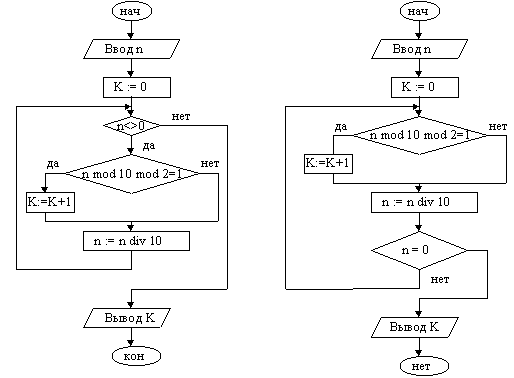 1. Ввести число n 2. K := 0 {подготавливаем счётчик} 3. Если n = 0, переход к п. 7 4. Если n mod 10 mod 2 = 1, то K := K +1 5. n := n div 10 6. Переход к п. 3 7. Вывод K 8. Конец |