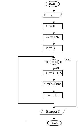 1. Ввестиe 2. S := 0 3. A := 1/4 4. n := 3 5. Сравнить А с e. Если A>=e, переход к п. 10 6. S := S + A 7. A := (n-1)/(n*n) 8. n := n + 1 9. Переход к п. 5 10. Вывод S 11. Конец |