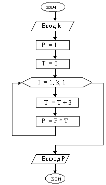 1. Ввод k 2. P := 1 {здесь накапливаем произведение} 3. T := 0 {здесь будут числа, кратные 3} 4. I := 1 5. Если I > k, переход к п. 10 6. T := T + 3 7. P := P * T 8. I := I + 1 9. Перейти к п. 5 10. Вывод P 11. Конец |