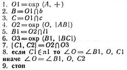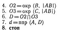 В приведенном алгоритме указание 6 означает: обозначить точку пересечения окружностей 02 и 03 именем D. Так как одной из точек пересечения окружностей 02 и 03 является точка A, то точка D может быть построена однозначно. Указание 7 означает: построить полупрямую d с началом в точке А и проходящую через точку D.