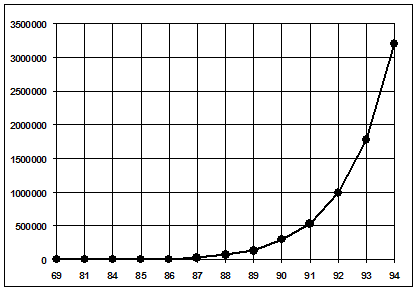 Рис.1. Рост числа хостов, подключенных к сети Internet.