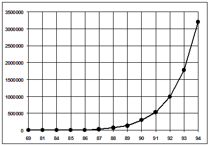 В 1983 году вышел первый стандарт для протоколов TCP/IP, вошедший в Military Standards (MIL STD), т.е. в военные стандарты, и все, кто работал в сети, обязаны были перейти к этим новым протоколам. Для облегчения этого перехода DARPA обратилась с предложением к руководителям фирмы Berkley Software Design - внедрить протоколы TCP/IP в Berkley (BSD) UNIX. С этого и начался союз UNIX и TCP/IP. Спустя некоторое время TCP/IP был адаптирован в обычный, то есть в общедоступный стандарт, и термин Internet вошел во всеобщее употребление. В 1983 году из ARPANET выделилась MILNET, которая стала относиться к Defence Data Network (DDN) министерства обороны США. Термин Internet стал использоваться для обозначения единой сети: MILNET плюс ARPANET. И хотя в 1991 году ARPANET прекратила свое существование, сеть Internet существует, ее размеры намного превышают первоначальные, так как она объединила множество сетей во всем мире. Рисунок 1 иллюстрирует рост числа хостов, подключенных к сети Internet с 4 компьютеров в 1969 году до 3,2 миллионов в 1994. Хостом в сети Internet называются компьютеры, работающие в многозадачной операционной системе (Unix, VMS), поддерживающие протоколы TCP\IP и предоставляющие пользователям какие-либо сетевые услуги.