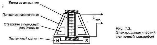 ленты (в микрофонах ленточных) в магнитном поле постоянного магнита. Это приводит к возникновению в катушке или ленте э.д.с. самоиндукции, в изменении которой и заложена информация.