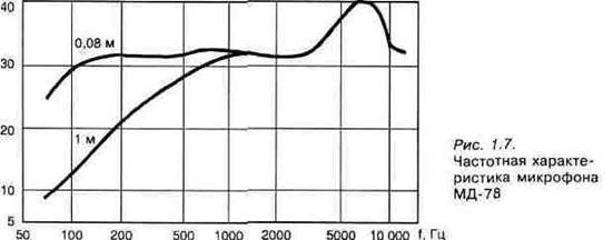 Из рис. 1.7 видно, что осевая частотная характеристика микрофона МД-78 сильно зависит от расстояния, на котором микрофон находится от источника звука. Сравнивая рис. 1.7 и 1.8, можно сделать вывод о том, что ЧХ электрет-ного микрофона существенно равномернее ЧХ микрофона динамического.