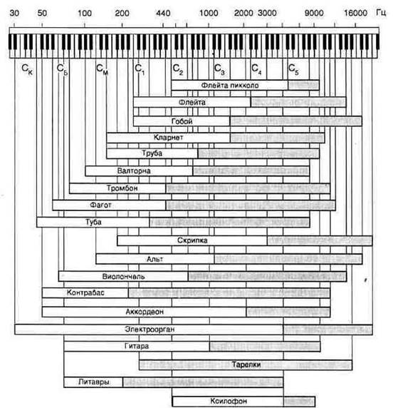 Рис. 1.10. Частотные диапазоны некоторых музыкальных инструментов