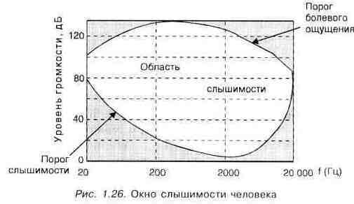 Наряду с абсолютным параметром — силой звучания — музыкальные инструменты характеризуются также динамическим диапазоном звучания: отношением мощности звука, извлекаемого из инструмента при исполнении «фортиссимо» (максимальная громкость), к мощности звука при игре «пианиссимо» (минимальная громкость). Динамический диапазон D звукового сигнала принято измерять в децибелах: D = 201g(P,nax/Pmin)i где Рщах и Pmin—максимальное и минимальное звуковые давления. В практических целях при определении динамического диапазона источника звука используют уровни звукового давления, вычисляя их разность. Например, максимальный уровень звучания рояля составляет 80 дБ, а минимальный — 35 дБ, то говорят, что его динамический диапазон составляет 80 — 35 = 45 дБ. При этом 80 и 35 дБ — это уровни звукового давления относительно условного нулевого акустического уровня (порога слышимости). В табл. 1.1 приведены параметры, характеризующие динамический диапазон некоторых источников звука.