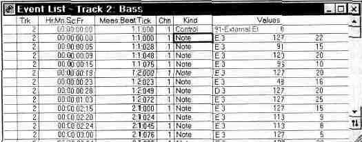 Каждая строка таблицы окна Event List содержит одно сообщение. В приведенном примере почти все сообщения относятся к типу Note и означают, что в такой-то момент следует включить такую-то ноту инструмента, закрепленного за первым MIDI-каналом. Лишь верхняя строка содержит сообщение управления манипулятором (контроллером). Громкостью звучания