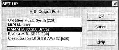 Вернемся в главное окно проигрывателя (рис. 1.38). Кроме стандартных кнопок управления и поля в стиле ЖК-индикатора с названием текущей музыкальной композиции, здесь имеются кнопки настройки проигрывателя (SET) и помощи (?), Нажав кнопку SET, вы вызовете окно диалога, возможный вид которого показан на рис. 1.40. В этом окне содержится список доступных MIDI-устройств. Выбрать можно только одно устройство. Оно и будет воспроизводить MIDI-файлы.