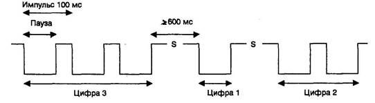 Скорость следования импульсов при наборе знаков телефонного номера обычно равна 10 импульсов в секунду, хотя в некоторых модемах возможна установка скорости 20 импульсов в секунду. Здесь и далее под импульсом набора понимается импульс набора номера, включающий в себя собственно импульс и паузу. Последовательность импульсного набора иллюстрируется рис. 12.1.