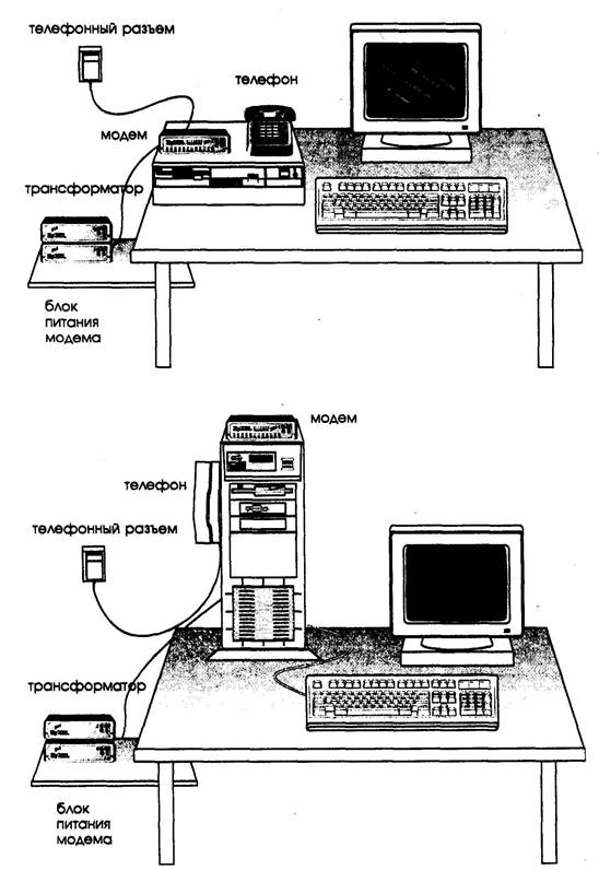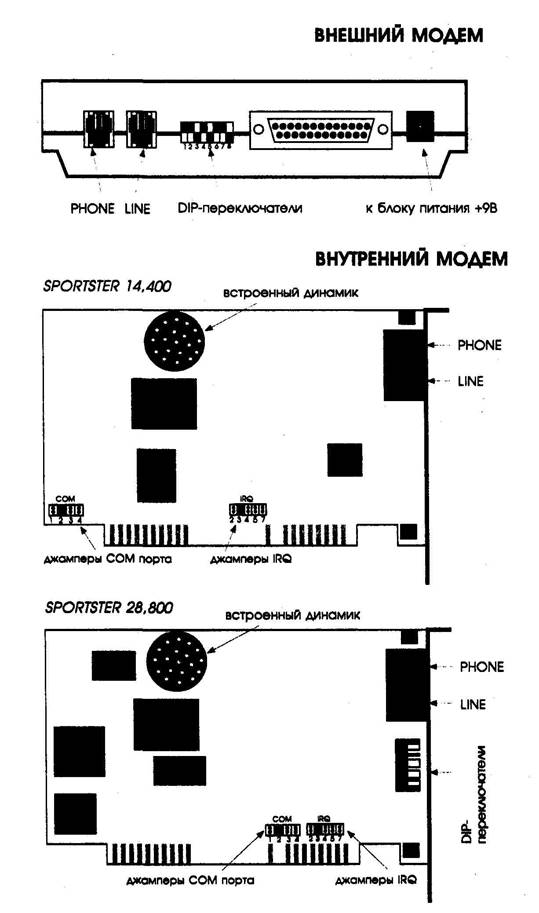 Конструктивно большинство модемов исполняются в виде внешних либо внутренних устройств. Часто один и тот же модем предлагается на рынке в виде таких двух решений. На рис. 12.2 показаны внешний и внутренние модемы Sporster.