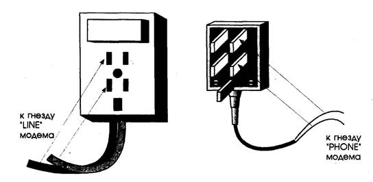 На задней панели внутренних модемов обычно имеются разъемы для подключения линии связи (LINE, TELCO), телефона (PHONE) и иногда оконечного оборудования данных (DTE) (в модемах для групповых блоков (пулов).