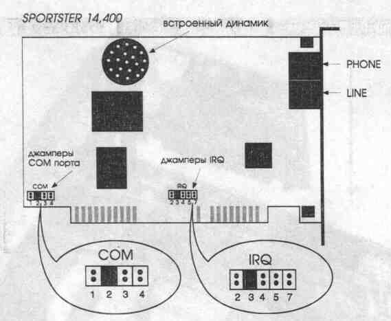 Непосредственно на модемной плате размещаются перемычки или DIP-переключатели для выбора коммуникационного порта и номера прерывания. При этом нежелательно одновременное использование портов СОМ1 и COM3 (линия IRQ4) или COM2 и COM4 (линия IRQ3).