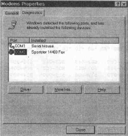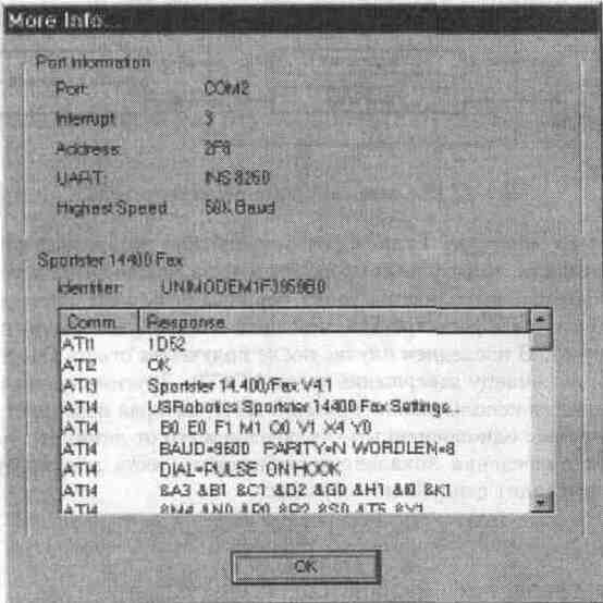 Пользователи Windows'95 могут просмотреть основные параметры и установки модема в меню Modems Properies (Control Panel \ Modems \Diagnostics\ More Info) (рис. 12.16). После нажатия на кнопку More Info. компьютер тестирует модем и результат выдает в удобном для просмотра виде (рис. 12.17)