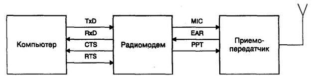Наиболее просто подключить радиостанцию, имеющую разъем для выносной гарнитуры, — устройства, совмещающего функции микрофона, телефона (громкоговорителя) и переключателя управления приемом/передачей радиостанции. В этом случае подключение сводится к изготовления соединительного кабеля от радиомодема к приемопередатчику. При этом, как и в любом другом случае, необходимо тщательно изучить техническую документацию как на ра-диомодем, так и на радиостанцию, особенно, касающуюся цепей коммутации.