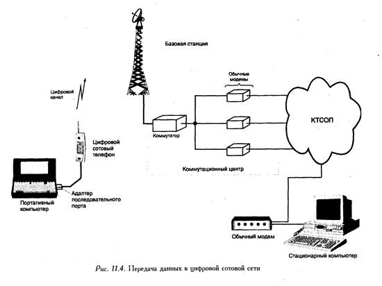 В цифровых сотовых системах при подключении сотового модема к аналоговому окончанию телефонного канала цифрового сотового телефона также можно воспользоваться подходами, приведенными на рис. 11.2 и 11.3. Однако в будущем ожидаются большие изменения в организации передачи данных по цифровым сотовым сетям.