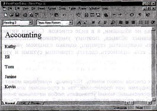 4. Завершив ввод списка, нажать комбинацию клавиш <Ctrl>+<Enter>. Редактор Frontpage начнет новую строку под списком и установит курсор на ее начало