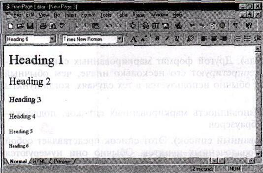 В вашем браузере эти заголовки могут выглядеть несколько иначе, чем в Редакторе Frontpage, поскольку браузер сам определяет, как именно они должны выглядеть. Это не имеет большого значения, т. к. в любом случае форматы этих заголовков задаются таким образом, чтобы заголовок более высокого уровня (наивысший уровень — первый) всегда был крупнее заголовка более низкого уровня. Как правило, чем важнее заголовок, а следовательно, выше его уровень, тем крупнее шрифт, тем больше интервалы до и после него.