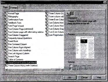 Чтобы создать новую страницу, выберите в меню File опцию New или нажмите комбинацию клавиш <Ctrl>+<N>. Вы увидите диалоговое окно New, изображенное на рис. 6.7. В окне New выберите нужный шаблон страницы или перейдите на вкладку Frames и выберите один из шаблонов страниц фреймов.