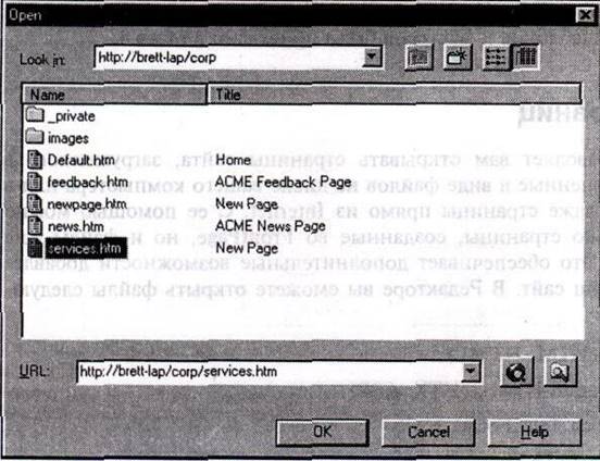 Если вы собираетесь редактировать страницу, входящую в текущий открытый в Проводнике сайт, то у вас есть два пути: во-первых, вы можете переключиться в Проводник, найти в нем нужную страницу и открыть ее оттуда (двойным щелчком мыши); во-вторых (это даже проще), вы можете открыть ее в Редакторе с помощью команды Open из меню File.