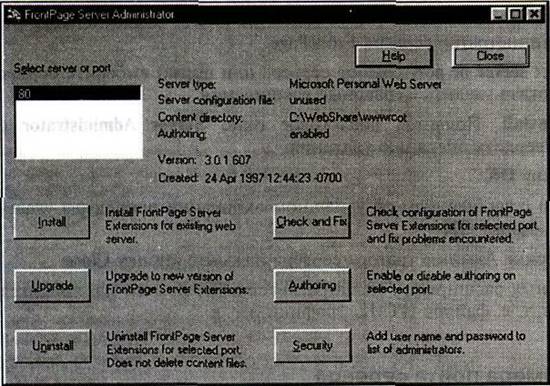 Ниже по шагам расписаны те процедуры, которые можно выполнить с помощью Windows-версии Администратора сервера Frontpage. Инструкции по использованию версии командной строки можно найти в разделе "Frontpage Server Administrator — Command Line Version" (Администратор сервера Frontpage — версия командной строки) справочной системы Frontpage.