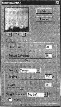 Фильтр Underpainting (Рисование на обороте) задуман в качестве имитации начальной стадии живописи маслом — подмалевка (рис. 12-16).