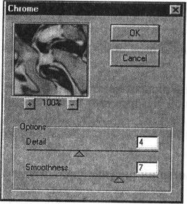 Фильтр Chrome (Хром) предназначен для имитации бликов и отражений, свойственных хромированным поверхностям, которые не имеют собственных изображений, но в зависимости от окружения (неба, облаков и так далее) создают картинку как во множестве кривых зеркал (рис. 12-39).
