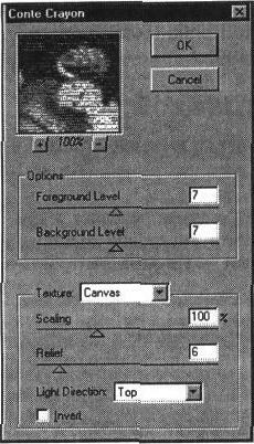 Фильтр Conte Crayon (Волшебный карандаш) служит для имитации рисунка цветным мелком или карандашом, которые создают на плоскости достаточно заметный рельеф (рис. 12-40).