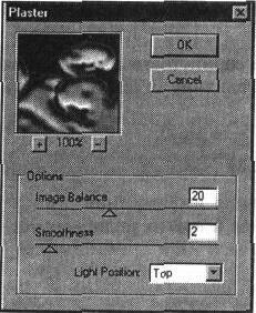 Фильтр Plaster (Гипс) используется для имитации плоских рельефов, получаемых из гипса или алебастра (рис. 12-45). Цветовая гамма строится из черного, серого и белого цветов.
