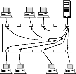 Для того, чтобы коммутатор работал в сетях с выделенным сервером более эффективно, производители коммутаторов выпускают модели с одним высокоскоростным портом на 100 Мб/с для подключения сервера и несколькими низкоскоростными портами на 10 Мб/с для подключения рабочих станций. В этом случае между рабочими станциями распределяется уже 100 Мб/c, что позволяет обслуживать в неблокирующем режиме 10 - 30 станций, в зависимости от интенсивности создаваемого ими трафика.