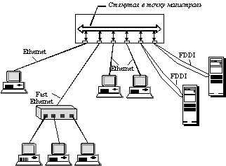 Положительной чертой такой схемы является не только высокая скорость магистрали, но и ее протокольная независимость. На внутренней магистрали коммутатора в независимом формате одновременно могут передаваться данные различных протоколов, например, Ethernet, FDDI и Fast Ethernet, как это изображено на рисунке. Подключение нового узла с новым протоколом часто требует не замены коммутатора, а просто добавления соответствующего интерфейсного модуля, поддерживающего этот протокол.