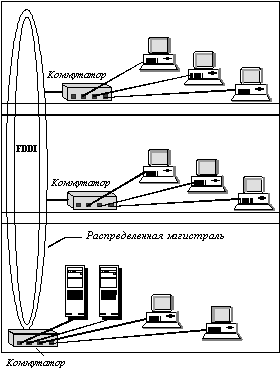 Распределенная магистраль - это разделяемый сегмент сети, поддерживающий определенный протокол, к которому присоединяются коммутаторы сетей рабочих групп и отделов. На примере распределенная магистраль построена на основе двойного кольца FDDI, к которому подключены коммутаторы этажей. Коммутаторы этажей имеют большое количество портов Ethernet, трафик которых транслируется в трафик протокола FDDI, когда он передается по магистрали с этажа на этаж.