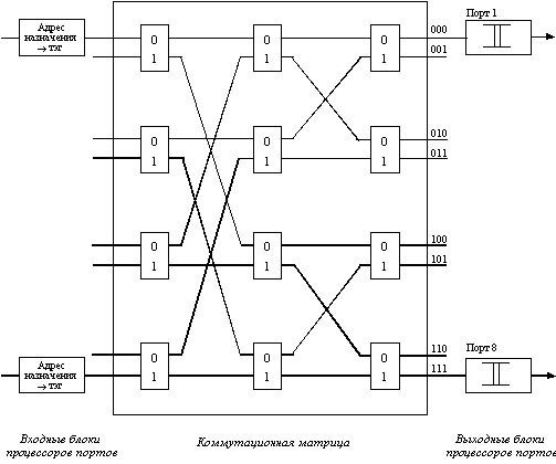 Матрица состоит из трех уровней двоичных переключателей, которые соединяют свой вход с одним из двух выходов в зависимости от значения бита тэга. Переключатели первого уровня управляются первым битом тэга, второго - вторым, а третьего - третьим.