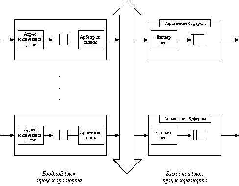 Память должна быть достаточно быстродействующей для поддержания скорости переписи данных между N портами коммутатора. Применение общей буферной памяти, гибко распределяемой менеджером между отдельными портами, снижает требования к размеру буферной памяти процессора порта.