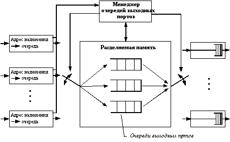 Входные блоки процессоров портов соединяются с переключаемым входом разделяемой памяти, а выходные блоки этих же процессоров соединяются с переключаемым выходом этой памяти. Переключением входа и выхода разделяемой памяти управляет менеджер очередей выходных портов. В разделяемой памяти менеджер организует несколько очередей данных, по одной для каждого выходного порта. Входные блоки процессоров передают менеджеру портов запросы на запись данных в очередь того порта, который соответствует адресу назначения пакета. Менеджер по очереди подключает вход памяти к одному из входных блоков процессоров и тот переписывает часть данных кадра в очередь определенного выходного порта. По мере заполнения очередей менеджер производит также поочередное подключение выхода разделяемой памяти к выходным блокам процессоров портов, и данные из очереди переписываются в выходной буфер процессора.