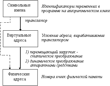 Физические адреса соответствуют номерам ячеек оперативной памяти, где в действительности расположены или будут расположены переменные и команды. Переход от виртуальных адресов к физическим может осуществляться двумя способами. В первом случае замену виртуальных адресов на физические делает специальная системная программа - перемещающий загрузчик. Перемещающий загрузчик на основании имеющихся у него исходных данных о начальном адресе физической памяти, в которую предстоит загружать программу, и информации, предоставленной транслятором об адресно-зависимых константах программы, выполняет загрузку программы, совмещая ее с заменой виртуальных адресов физическими.