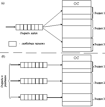 Самым простым способом управления оперативной памятью является разделение ее на несколько разделов фиксированной величины. Это может быть выполнено вручную оператором во время старта системы или во время ее генерации. Очередная задача, поступившая на выполнение, помещается либо в общую очередь (рисунок 2.9,а), либо в очередь к некоторому разделу (рисунок 2.9,б).