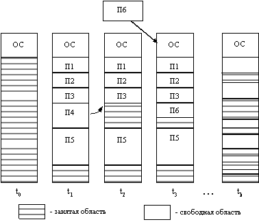 В этом случае память машины не делится заранее на разделы. Сначала вся память свободна. Каждой вновь поступающей задаче выделяется необходимая ей память. Если достаточный объем памяти отсутствует, то задача не принимается на выполнение и стоит в очереди. После завершения задачи память освобождается, и на это место может быть загружена другая задача. Таким образом, в произвольный момент времени оперативная память представляет собой случайную последовательность занятых и свободных участков (разделов) произвольного размера. На рисунке 2.10 показано состояние памяти в различные моменты времени при использовании динамического распределения. Так в момент t0 в памяти находится только ОС, а к моменту t1 память разделена между 5 задачами, причем задача П4, завершаясь, покидает память. На освободившееся после задачи П4 место загружается задача П6, поступившая в момент t3.