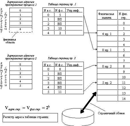 На рисунке 2.12 показана схема страничного распределения памяти. Виртуальное адресное пространство каждого процесса делится на части одинакового, фиксированного для данной системы размера, называемые виртуальными страницами. В общем случае размер виртуального адресного пространства не является кратным размеру страницы, поэтому последняя страница каждого процесса дополняется фиктивной областью.
