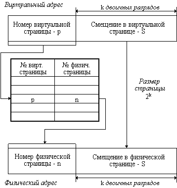 Виртуальный адрес при страничном распределении может быть представлен в виде пары (p, s), где p - номер виртуальной страницы процесса (нумерация страниц начинается с 0), а s - смещение в пределах виртуальной страницы. Учитывая, что размер страницы равен 2 в степени к, смещение s может быть получено простым отделением k младших разрядов в двоичной записи виртуального адреса. Оставшиеся старшие разряды представляют собой двоичную запись номера страницы p.