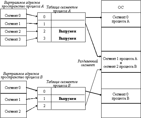 При страничной организации виртуальное адресное пространство процесса делится механически на равные части. Это не позволяет дифференцировать способы доступа к разным частям программы (сегментам), а это свойство часто бывает очень полезным. Например, можно запретить обращаться с операциями записи и чтения в кодовый сегмент программы, а для сегмента данных разрешить только чтение. Кроме того, разбиение программы на "осмысленные" части делает принципиально возможным разделение одного сегмента несколькими процессами. Например, если два процесса используют одну и ту же математическую подпрограмму, то в оперативную память может быть загружена только одна копия этой подпрограммы.