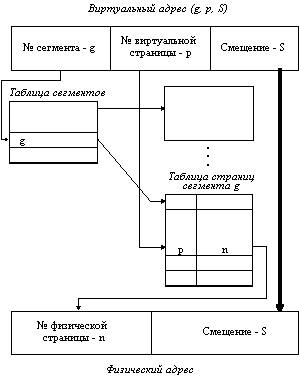 Как видно из названия, данный метод представляет собой комбинацию страничного и сегментного распределения памяти и, вследствие этого, сочетает в себе достоинства обоих подходов. Виртуальное пространство процесса делится на сегменты, а каждый сегмент в свою очередь делится на виртуальные страницы, которые нумеруются в пределах сегмента. Оперативная память делится на физические страницы. Загрузка процесса выполняется операционной системой постранично, при этом часть страниц размещается в оперативной памяти, а часть на диске. Для каждого сегмента создается своя таблица страниц, структура которой полностью совпадает со структурой таблицы страниц, используемой при страничном распределении. Для каждого процесса создается таблица сегментов, в которой указываются адреса таблиц страниц для всех сегментов данного процесса. Адрес таблицы сегментов загружается в специальный регистр процессора, когда активизируется соответствующий процесс. На рисунке 2.15 показана схема преобразования виртуального адреса в физический для данного метода.