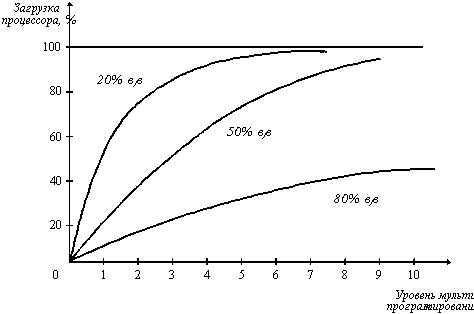 На рисунке 2.16 показан график зависимости коэффициента загрузки процессора в зависимости от числа одновременно выполняемых процессов и доли времени, проводимого этими процессами в состоянии ожидания ввода-вывода.